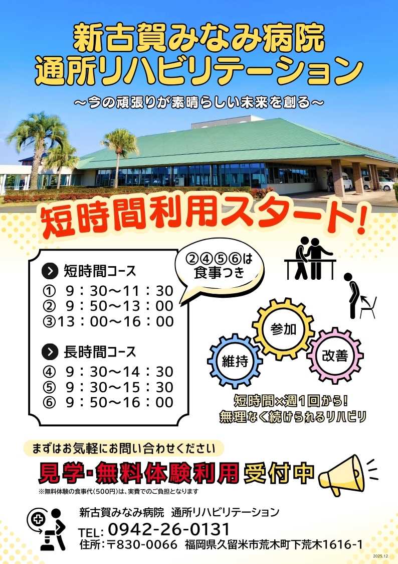 - 【新古賀みなみ病院】通所リハビリを2時間&週1回から利用で…