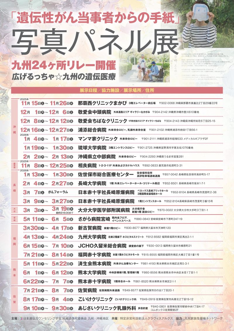 2026年3月30日(月)から4月17日(金)までの期間、新古賀病院 東館1階「遺伝性がん当事者からの手紙」写真パネル展を開催いたします。 遺伝性のがんと診断された方、ご家族が遺伝性のがんの方の経験や伝えたい思いがぎっしりつまったパネルを展示しています。 一般の方も大歓迎です。皆さまのご来場をお待ちしております。