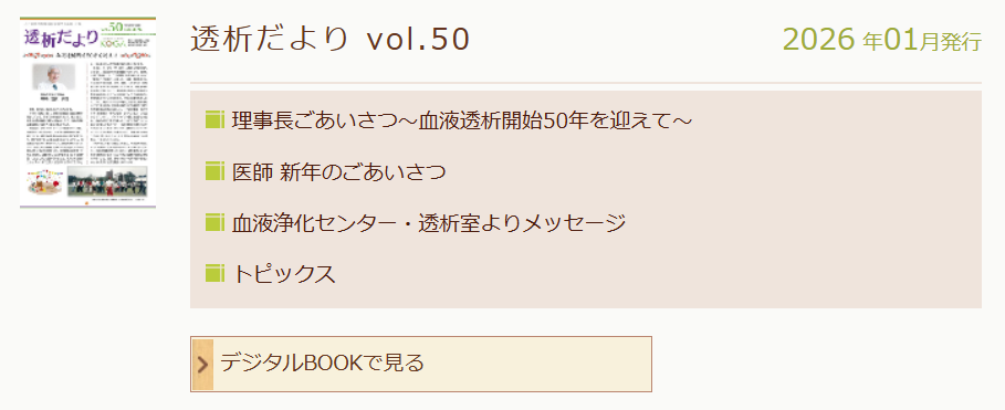 今号では、血液治療開始から50年の節目を迎え、当グループ・理事長のご挨拶をはじめ、透析治療を支える医師や各スタッフからの2026年の抱負や患者さんへのメッセージをお届けしています。また、今年1年も安心・安全に透析治療を続けていただくために、薬剤師や看護師、臨床工学技士や管理栄養士といった透析治療を支えるスタッフより、治療に役立つ健康知識を発信しています。