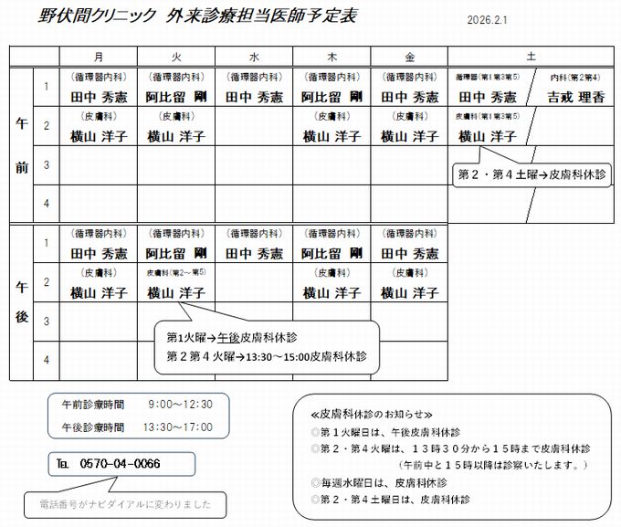 野伏間クリニックの代表電話番号が、ナビダイヤル(Tel.0570-04-0066)に変更となります。